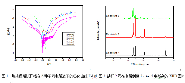 不銹鋼中含有較高的Cr、Ni, 溶液中很容易鈍化, 而且鋼中含有的碳化物及金屬間化合物大都比較穩(wěn)定, 所以電解液的酸度應(yīng)該比較大, 活性離子含量也應(yīng)較高, 在水溶液中進行電解是比較困難的,如果用醇做溶劑, 對基體活化溶解的效果更好,同時可以抑制一些相的水副反應(yīng)的發(fā)生,并使電解后的表面光滑,從而減少損失,便于洗滌。試驗首先考查了試樣棒2號在六種不同電解制度下(電解液不同,但均以醇為溶劑)的極化曲線(圖1)。即利用析出相與基體在電解液中穩(wěn)定電位的差別,外加電流使試樣極化,當(dāng)極化條件合適(即電極電位介于基體的穩(wěn)定電位與析出相穩(wěn)定電位之間),合金基體以一定的速度電解,目的相則以不溶性殘渣的形式被提取出來。圖1顯示腐蝕電流從大到小分別為電解制度4-5-2-6-1-3。因此,電解制度6,1,3的電解速度相對要慢。電解效果也證明了2205雙相不銹鋼在電解制度2,4,5中的電解效果比較好。而電解制度3和6的均出現(xiàn)明顯的點蝕現(xiàn)象。