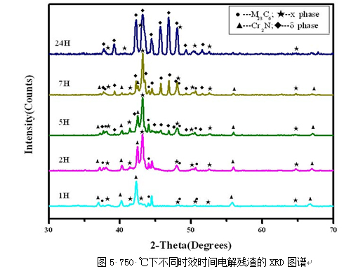 (2)750 ℃時效1 h后,析出相主要是以M23C6和Cr2N為主, 到2小時,χ相開始形成;5 h以后則有部分σ相出現(xiàn),而后伴隨著時間的延長,σ相越來越多,相應(yīng)χ相開始減少,到24 h時,σ相已經(jīng)占主導(dǎo)地位,且形成的晶體很完整,XRD圖譜峰和清晰明顯。