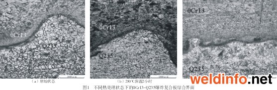 在壓力容器行業中,特別是一些用于化學工業的設備,由于長期在具有腐蝕性的環境中服役,因此對其制造材料的耐腐蝕性能有很高的要求。如果用單一的耐腐蝕材料進行制造,雖然滿足了使用要求,但是大大提高了生產成本。可以考慮在保證材料強度和使用性能的前提下,通過在價格相對便宜的基板上復合一層耐腐蝕板材來達到降低成本的目的[1]。            本文以0Cr13不銹鋼-Q235碳鋼爆炸銹鋼復合板為試驗對象,研究了不同熱處理時長對其結合界面在組織形態、元素擴散及顯微硬度等方面的影響,為確定合適的熱處理時間提供了理論指導。