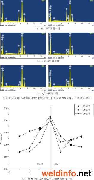 通過掃描電鏡自帶的X射線能譜儀對2#、3# 試樣的基層金屬,結合界面以及復層金屬三個區域進行了分析,結果如圖3所示,每個區域各主要元素的含量列于表3、表4之中。由試驗數據可得,隨著熱處理時間的增加,界面兩側元素的相互擴散進行得更加充分,Q235中的Cr含量和0Cr13中的Mn、C含量顯著上升[7]。在不銹鋼一側,長時間的熱處理有助于碳化物的分解,使Cr元素重新固溶到母材之中,消除了貧鉻現象對材料耐腐蝕性能的影響。同時,結合界面處由于熱處理時間的增加導致碳化鉻數量的增加, 脆硬的碳化鉻提高了界面處的強度、硬度,但對其塑性、韌性有不利的影響。